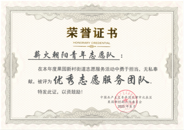“薪火朝阳”青年志愿队荣获由街道工委颁发的“优秀社会实践服务团队”证书,并收到来自社区居委会的诚挚感谢信。