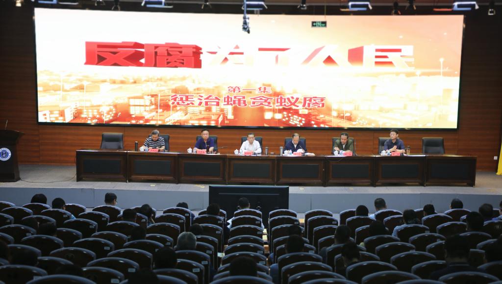 全体参会人员集中观看警示教育片“《惩治蝇贪蚁腐》之校园餐腐败”,学习教育系统警示教育案例。
