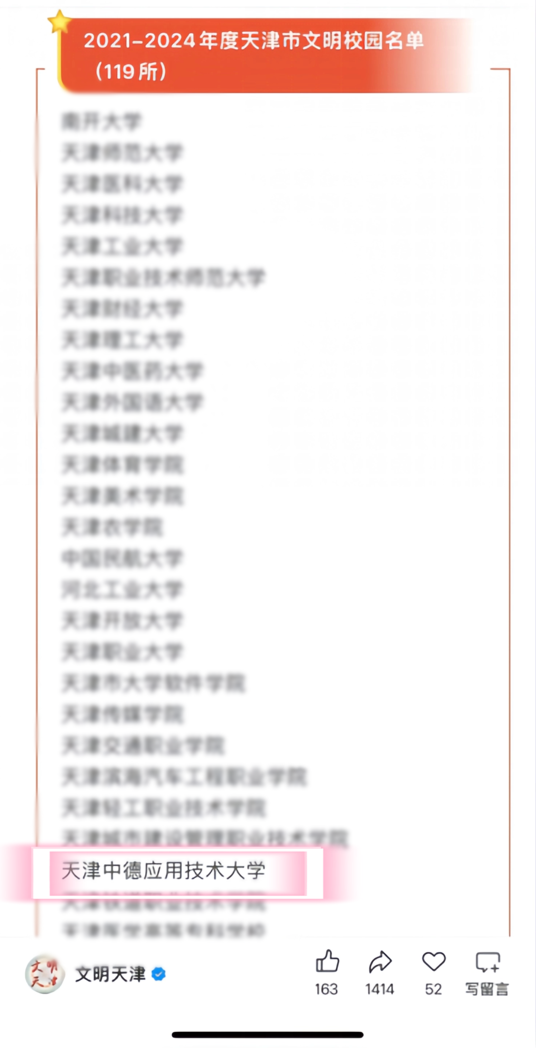 我校将以此次获批天津市文明校园为契机,以更高标准、更严要求,争做精神文明建设的表率,坚持不懈用党的创新理论凝心铸魂,推动习近平新时代中国特色社会主义思想入脑入心,持续深化社会主义精神文明建设,广泛开展精神文明创建,推动“争做文明有礼天津人”主题活动走深走实,努力为全面建设社会主义现代化大都市、奋力谱写中国式现代化天津篇章作出中德贡献。