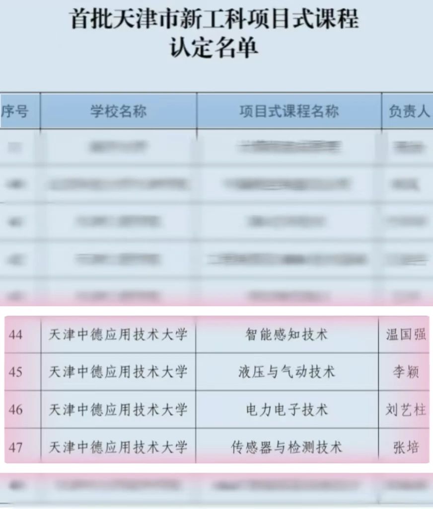 近日,天津市教育委员会公布首批市级新工科项目式课程建设名单,天津中德应用技术大学申报的《智能感知技术》《液压与气动技术》《电力电子技术》《传感器与检测技术》四门课程全部获批,标志着学校在新工科建设领域取得重大突破。此次入选课程数量位居天津市高校前列,充分体现学校在产教融合、课程改革及创新人才培养模式上的显著成效。