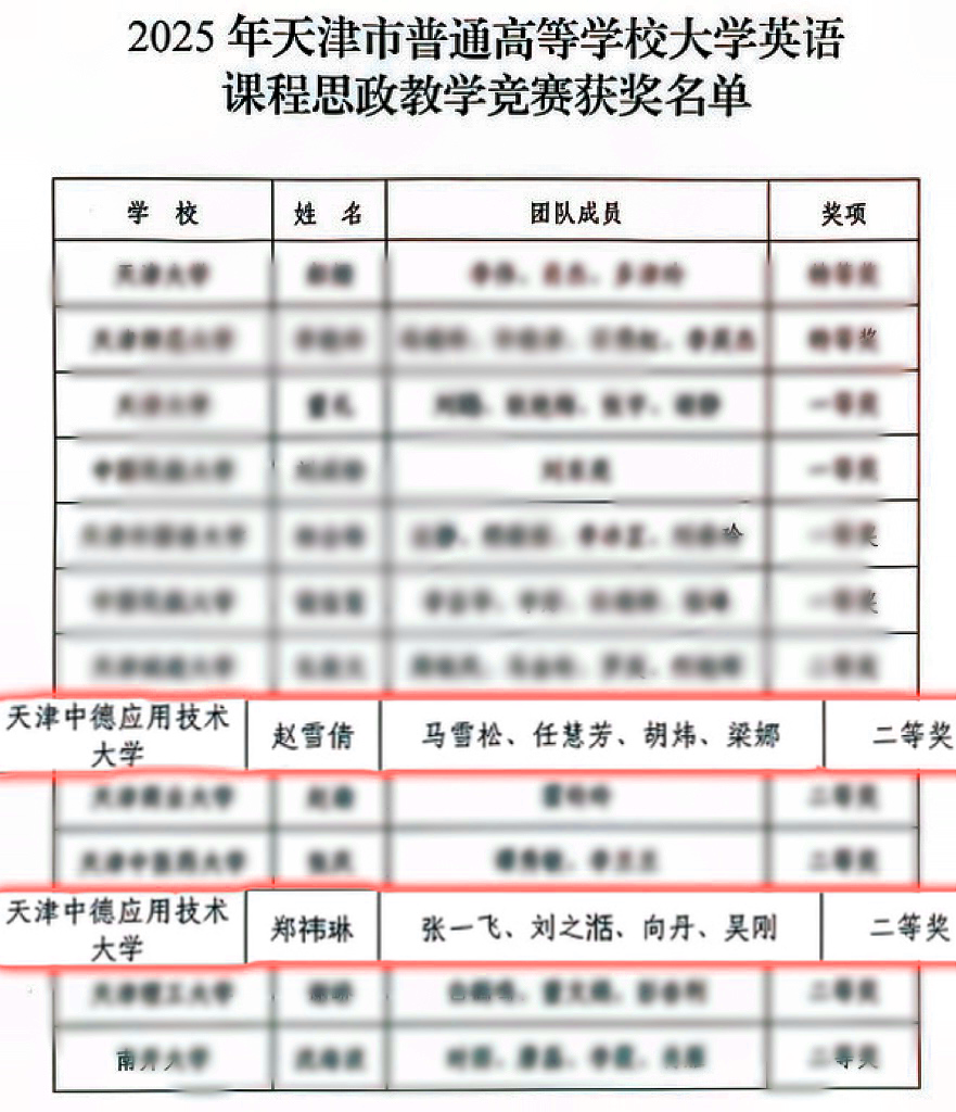 近日,由天津市教育委员会主办的天津市普通高等学校大学英语课程思政教学竞赛天津赛区决赛圆满落幕。我校应用外国语与国际教育学院赵雪倩老师团队、郑祎琳老师团队凭借扎实的教学功底、创新的课程设计与深刻的思政内涵,从众多参赛队伍中脱颖而出,双双荣获二等奖。