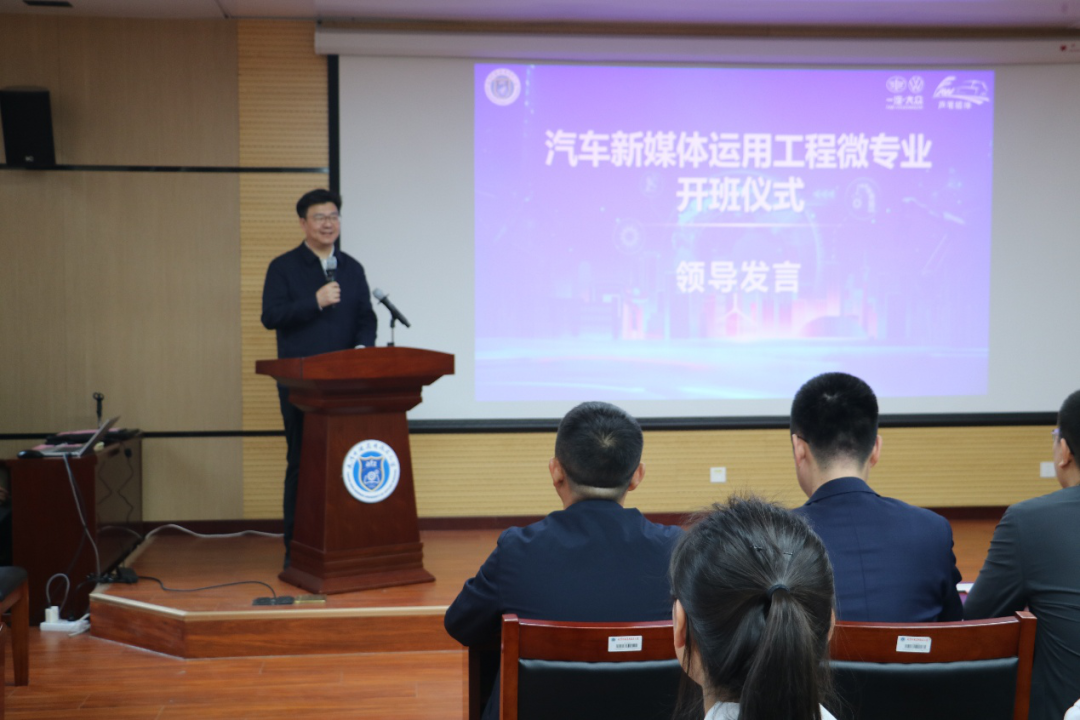 开班仪式上全面介绍了微专业的建设背景与实施路径,并提出以深化产教融合、提升人才培养质量、助力学生高质量就业的建设目标,通过“专业基础+运营技能+品牌认知+综合实践”的一体化培养体系,就汽车新媒体实习生培养模式、实践平台、项目资源及就业衔接等内容进行详细解读,为汽车新媒体人才培养提供了清晰路径与坚实保障。