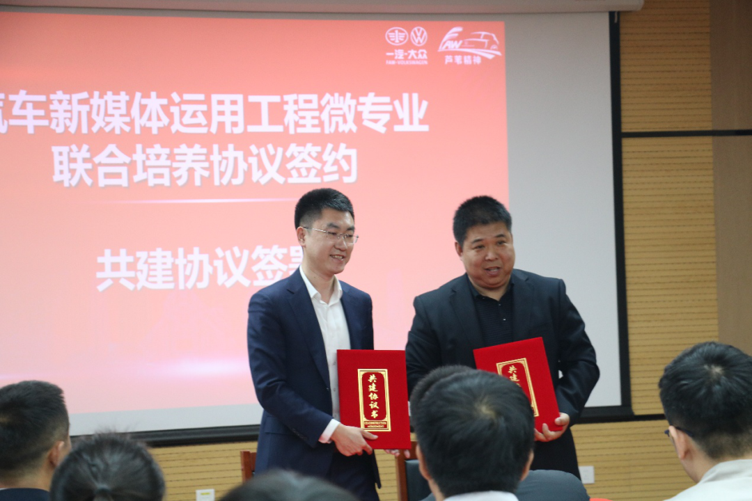 仪式现场举行了企业导师聘任仪式、汽车新媒体数字化技术联合培养基地揭牌仪式、联合培养协议签署仪式,标志着学校与一汽-大众天津分公司在校企协同育人、实践基地共建、课程资源共享、人才定向培养等方面进入深度合作新阶段。